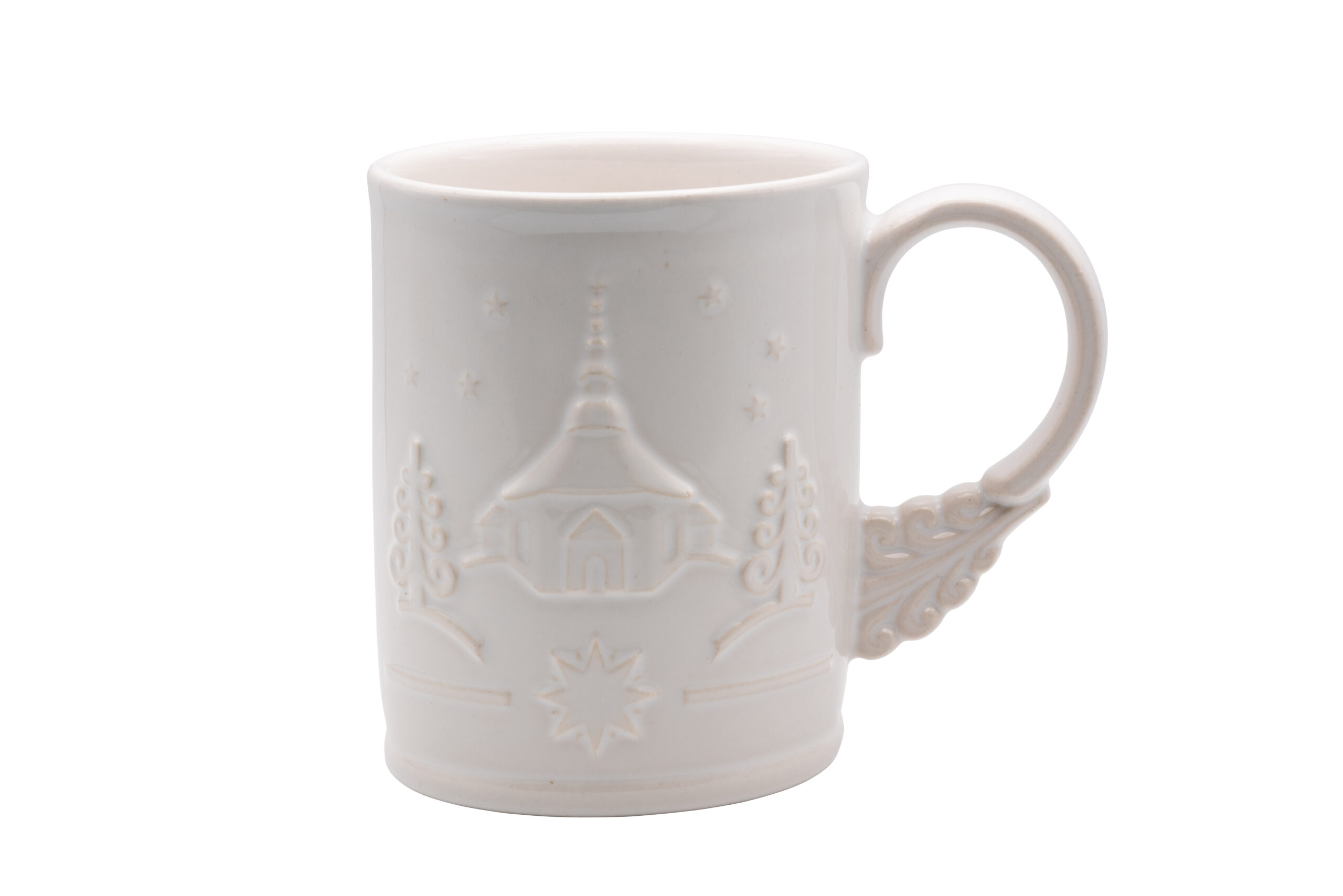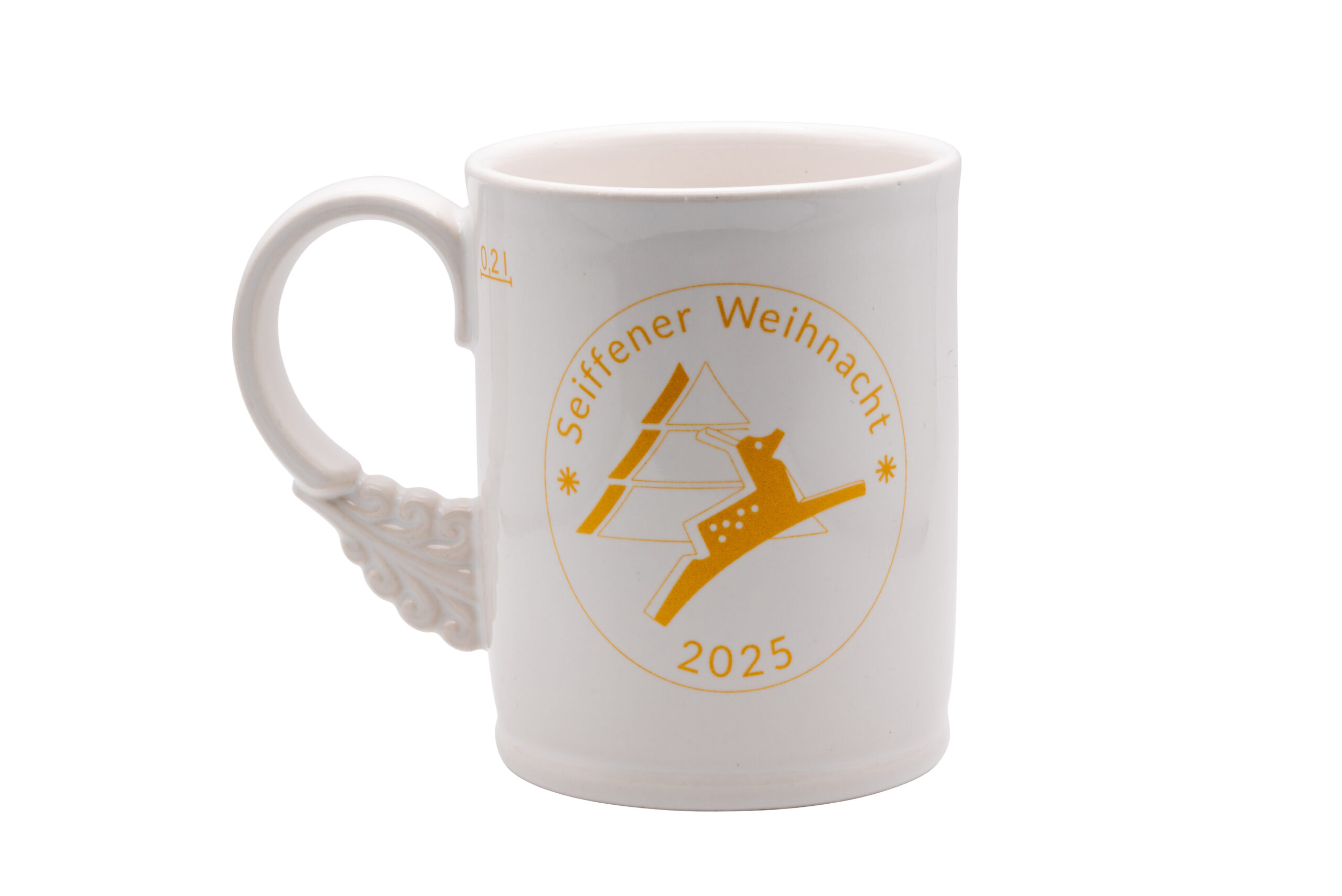 Die Rückseite der Tasse bildet ein Relief der Seiffener Kirche mit zwei Spanbäumchen.